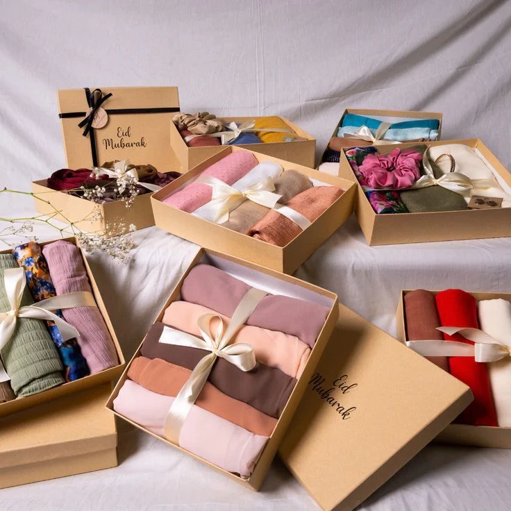 Celebrate Eid with an elegant gift hamper featuring a Premium Hijab Collection in festive hues like emerald green, royal blue, and soft blush pink, available in chiffon, cotton, or silk.